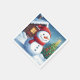 A festive snowman adorned with a red hat and scarf, standing next to a beautifully decorated Christmas tree during a snowy winter evening near a charming wooden cabin.