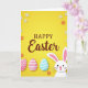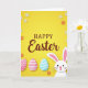 Designed with a sunny yellow background, this digital illustration centers a seasonal greeting in dark red serif lettering with a flowing cursive accent, placed right in the middle. A white long-eared bunny 🐰 peeks up from the bottom right, its pink-lined ears, tiny whiskers, and heart-shaped nose giving it a tender, friendly look. Small flowers scattered around the scene add a gentle spring touch, with petals in white and warm orange. Soft shadows beneath the shapes create a slight lifted effect, making the elements feel layered without looking heavy. Along the lower left sit three decorated egg shapes that feel like they were arranged with care, like a shared tradition between close friends. One egg is pink with neat white polka dots, another is pink with white horizontal stripes, and the third is aqua with slim white diagonal bands 🌷. The bunny’s face is turned toward the centered words while the patterned eggs line the lower-left edge beneath the blossoms.