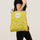 A cheerful whimsical yellow and white curvy doodle pattern covers this stylish tote with bright colourful style. A round frame at the upper part of the design has a text template to personalise with your monogram initial and name.