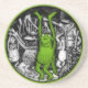 A very happy mob of frogs with big smiles cheering, while looking up and waving their hands in the air. Fun illustration by John Dickson Batten featured in the book, "More English Fairy Tales", published in 1894.