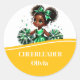 This classic round sticker is shown with a cute cheerleader print with a sample name, customise with this template shown and change the name to yours.