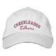 Pretty white cotton ball cap, with burgundy coloured embroidered text reading CHEERLEADER, in a slight arch shape. Burgundy script font embroidery, under Cheerleader text, is ready to personalise. Great for cheerleaders and cheer coaches.