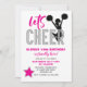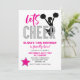 Let's Cheer! Cheerleading birthday party invitation in pink, silver glitter and black.