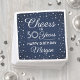 Add an elegant personalised touch to birthday party decorations with these custom navy blue and white paper napkins. Design features modern script calligraphy customisable "Cheers to 50 Years" and silver faux glitter confetti dots on a navy blue background. This template is set up for a 50th birthday celebration, but is simple to personalise to a different year. Happy Birthday!