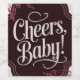 A stylish and modern wine label design featuring the text "Cheers, baby!" in an elegant, playful script font. The label has a sophisticated yet fun aesthetic, with a deep burgundy and gold color scheme. Subtle grapevine illustrations or abstract wine splashes add a touch of artistry. The background is either textured parchment or sleek matte black for a premium feel. The overall design should be balanced, eye-catching, and suitable for a high-end or celebratory wine bottle.