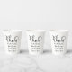 Wedding paper party cups feature chic black script "Cheers" text with arrow monogram design that can be personalised with the bride and groom names and wedding date.