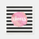 Toast to the good life with these pretty cocktail napkins. Design features a black and white stripe background with a pink watercolor blot and "Cheers" in white brushstroke text. Perfect for stocking your bar cart!