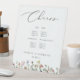 A modern wedding bar menu sign with a bottom border of colourful watercolor wild flowers. "cheers" is in grey modern calligraphy style font. Personalise with your wedding details.