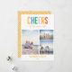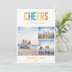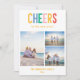 Colourful CHEERS, New Year's photo card. Features, 3 photo centre collage design, template lines for your name and year with coordinating yellow and white abstract shape pattern backing.