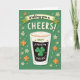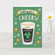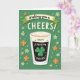 This card shows a tall glass of dark stout centered on the front, topped with creamy foam sprinkled with small orange dots, like confetti caught in the head of the drink ☘️. A bright green shamrock sits on the glass, and the words “Happy St. Patrick’s Day” appear just above it in matching green, giving the design a friendly, toasting-together feel. Near the top, a curled banner stretches across with “Wishing you a CHEERS!” in light lettering that stands out against the deep green background. The same “CHEERS!” is echoed again inside the glass, tucked into the dark fill as if the toast is shared between close friends across the table 💚. Behind everything, the setting is a rich verdant green with subtle vertical stripes that add depth without stealing focus. Scattered across the background are small stars, three-leaf shamrocks, and simple four-petaled flowers in olive, white, and orange, arranged like a festive sprinkle around the central drink. The outlines have a slightly uneven, drawn look that makes the shapes feel relaxed and human, like a friendly wink in ink. The brightest detail is the neon-leaning green shamrock glowing against the nearly black stout while white stars and orange florets dot the striped green field.