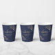 Celebrate in style with these elegant navy blue wedding paper cups featuring the word cheers in flowing gold calligraphy. Adorned with vintage floral illustrations, these cups add a romantic and sophisticated touch to your cocktail hour, reception, or signature drink station.