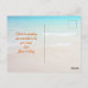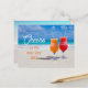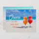 Happy new year postcards with "Cheers to the new year" text on the front. Two tropical drinks sit on a sunny beach next to the wording with tropical turquoise water in the background. On the back, include your own personal message using the printed, red text, or delete the wording and buy blank.