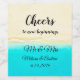 Pretty personalised weeding wine bottle label with pretty ocean shore, teal water, sandy beach that says, "Cheers" with the wedding date and bride and grooms names.