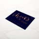 This modern and elegant happy new year postcard for 2024 features trendy rose gold foil script typography that says "cheers to 2024" on a dark navy blue background.