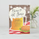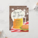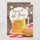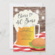 Cheers to 40 years birthday barbecue invitation featuring a beer mug & burger set on a rustic wood background with hanging mason jar lights