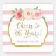 Cheers to 40 years birthday party favour tag stickers with light pink and white stripes, gold text, and pink watercolor flowers.