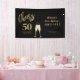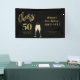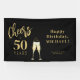 Modern gold and black Cheers to 50 years Happy Birthday name personalized party banner featuring champagne flutes and bold typography script.