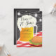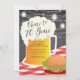 Cheers to 70 years birthday barbecue invitation featuring a beer mug & burger set on a black chalkboard background with hanging mason jar lights