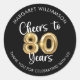 Cheers to 80 Years Script Balloon Thank You Round Sticker. Use these festive, personalised party favour stickers to thank your guests for celebrating your guest of honour at an 80th birthday party. These custom colour stickers feature a name, a CHEERS TO 80 YEARS design with faux metallic gold balloon numbers and modern script typography and your custom message below (the sample says THANK YOU FOR CELEBRATING WITH US!). The sample shows white text on a black background; you can change the text and background colours to coordinate with your party theme colours in EDIT. ASSISTANCE: For help with design modification or personalisation or if you would like coordinating items, contact the designer BEFORE ordering via Zazzle Chat or email makeitaboutyoustore@gmail.com.