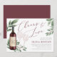 Planning a wine themed or wine tasting bridal shower, or hosting the big event at a winery or vineyard? Invite your guests with our elegant wine tasting bridal shower invitations, featuring a bottle of red wine and two wine glasses and adorned with green watercolor eucalyptus leaves and foliage. "Cheers to Love" appears in chic calligraphy script lettering. For a finishing touch, personalize the wine bottle label with the couple's initials. Perfect for bridal showers in wine country, winery or vineyard settings.