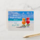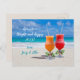 Tropical beach, cheers to the new year postcards. Two drinks on a tropical beach are decorated with starfish and holly. Customise the greeting and add a signature. An address template is provided on the back of the cards, or that text can be removed.