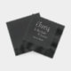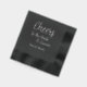 Personalised and foil printed, black cocktail paper napkins for your wedding event that feature the bride and groom's names printed in stylised script. Customise your napkins by editing and replacing bride and groom names. Select your paper napkin style.