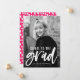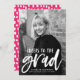 Stylish, modern graduation announcements featuring the graduate's vertical photo with "Cheers to the grad" in a white, hand-lettered brush script. Personalise the front of the announcement by adding the graduate's name, school name, and graduation year. The photo graduation announcement reverses to display a hot pink and white abstract dot pattern.