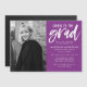 Invite guests to celebrate the graduate with our Cheers to the Grad graduation party magnetic invitations. The magnetic graduation party invites feature the graduate's vertical photo on the left. "Cheers to the grad" is displayed in a white, hand-lettered brush script with a purple background. Personalize the design by adding the graduate's name, school name, graduation year, and party details.