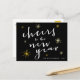 'Cheers To The New Year' Classic White Script With Simple Decorative Gold - Yellow Starbursts And Fireworks On A Black Background, Modern Holiday Postcard.