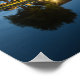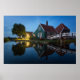 Poster print of a traditional wooden house used as a cheese farm in green paint with red tiles with reflection in the water at the start of the night at twilight in the Zaanse Schans museum in Holland.
