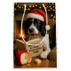 Individually designed Christmas gift bag featuring a black and white Spaniel reading a book entitled 'Cheese Tax at Home Regulations 2025'.