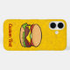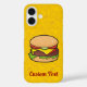 Cheeseburger cartoon illustration on yellow junk food seamless background. Custom text.
