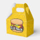 Cheeseburger cartoon illustration. Junk food outline icons yellow pattern background. Custom text on both sides.