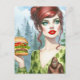 A woman in a Sasquatch print shirt holds a cheeseburger in the forest AI generated art