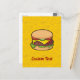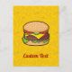 Cheeseburger cartoon illustration. Junk food outline icons yellow pattern background. Custom text.