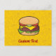 Cheeseburger cartoon illustration. Junk food outline icons yellow pattern background. Custom text.
