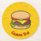 Cheeseburger cartoon illustration. Junk food outline icons yellow pattern background. Custom text.