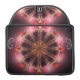 This fractal image depicts a large cheesecake cut into 12 slices. Each slices appears to be decorated with a bluish-green edible stencil of an abstract-looking angels. There is a triangle that represents the dress, two upside-down triangles above it that look like wings. Instead of a head, there are seven bands that stretch towards the top of the stencil. Surrounding the cheesecake are alternating pink and orange beads meant to serve as ornate decorations. Finally at the very top and bottom of the cheesecake are two yellowish angels. If you want a little slice of Heaven, then this is the perfect design for you!
