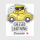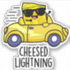 Cheesed Lightning Funny Cheese Pun features a cute cheese zooming by in his hot rod . Perfect Puns gift for family and friends who love cute cheese puns.