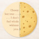 This coaster reads "Cheesy but true . . . I don't feel whole without you." The declaration is illustrated with half of a cheese wheel and the feeling that its better half is missing.