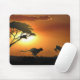 The silhouette of a cheetah chasing down a gazelle. The sunset blazes behind them.
