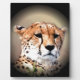 This artwork features a close-up portrait of a cheetah, with the animal's face dominating the frame. The composition is straightforward, allowing viewers to focus on the cheetah's calm expression and unique markings. In the background, there’s a subtle suggestion of a full moon, adding a touch of mystique to the scene.