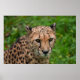 A close-up image of a cheetah staring directly at the camera. The cheetah's face fills the frame, highlighting its intense gaze and distinctive facial features. The background is a lush shade of green, providing a vibrant contrast to the cheetah's spotted fur.