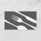 Modern, minimalistic and elegant catering, restaurant or chef business cards featuring white cutlery silhouettes (knife, fork, spoon) on a dark grey background. Customisable contact information on the back, grey and orange text. The design is contemporary with simple elegance. Ideal for a chef, private or personal chef, catering business etc.
