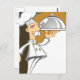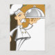 Brown and white design with a chef in tall hat and apron holding a steaming covered dish in his hand