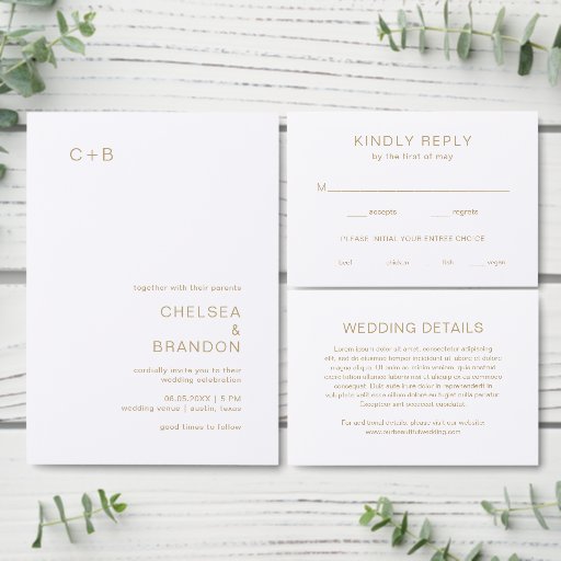 Modern Tri-fold Wedding Invitation featuring a simple and minimalist layout with your monogram in the upper left corner and your wedding details in the bottom right corner. The middle panel has your favourite photo, the right panel has the RSVP Postcard and the back has the Enclosure Card. All design elements are in faux gold and may be changed in the design editing tool. This chic all in one wedding invitation with a minimal yet elegant design goes well with any style of contemporary wedding.