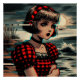 vintage illustration features a girl in a classic tartan dress, enhanced with glitch art effects.