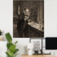 A chemist holds a bottle in his hand. He stands in the laboratory next to a table filled with flasks, beakers, bottles and a microscope. From an original 19th century (1892) etching (En coux d'execution) by Flameng. All Rights Reserved © 2014 padre art