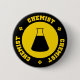 Black and caution yellow button pin with collegiate style lettering and Erlenmeyer flask.