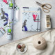 For the Scientist or Chemist in your family; Chemistry set wrapping paper features a microscope, a set of beakers, and a partially finished molecular structure.